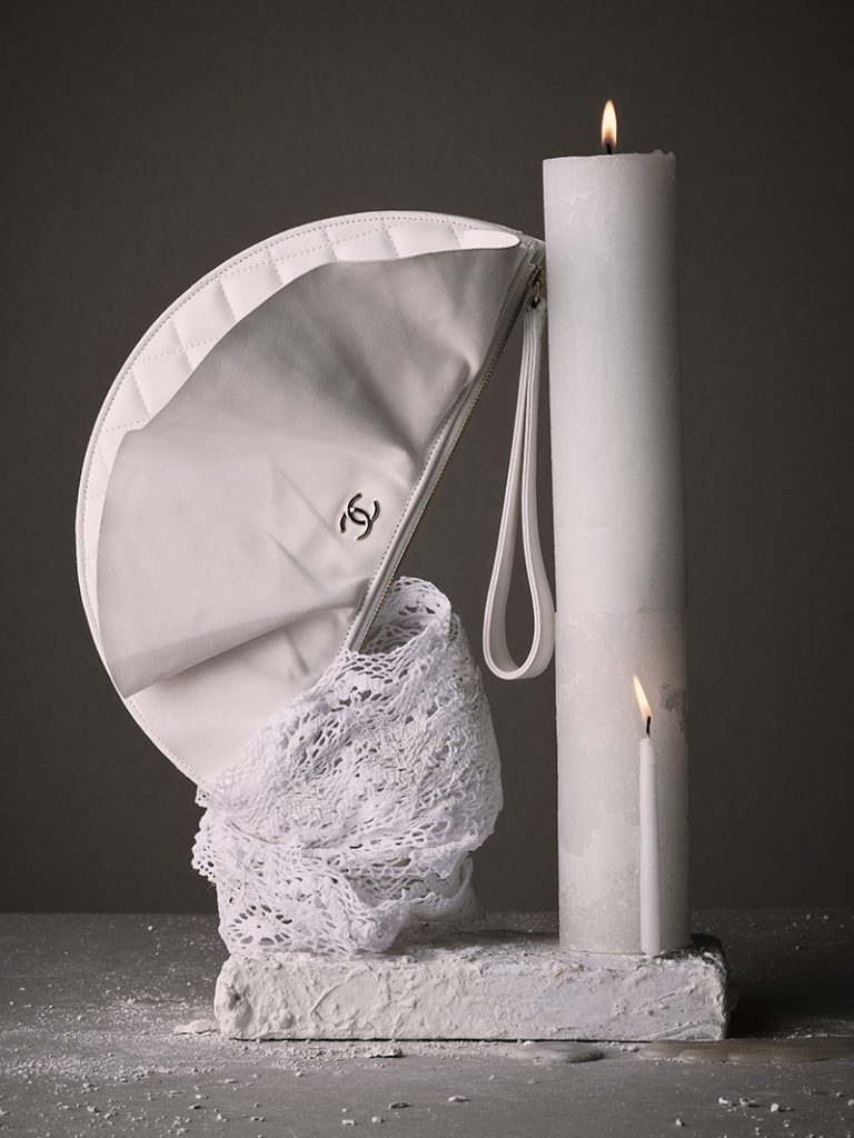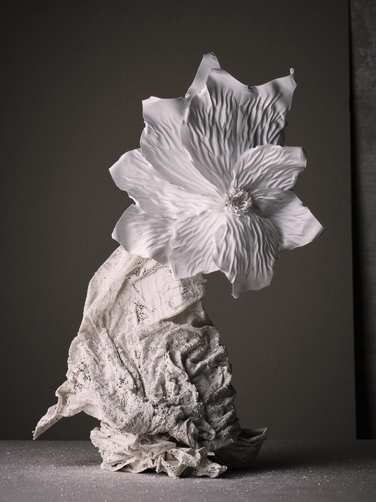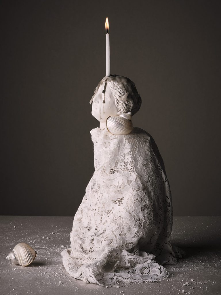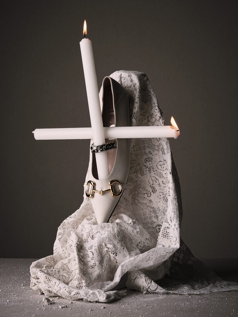 The “puntilla” is a traditional lace edging, hand made in linen or silk and historically made by nuns. We covered it in plaster to give it consistency and the heaviness necessary to make a religious-themed story for the March issue of Vogue España.